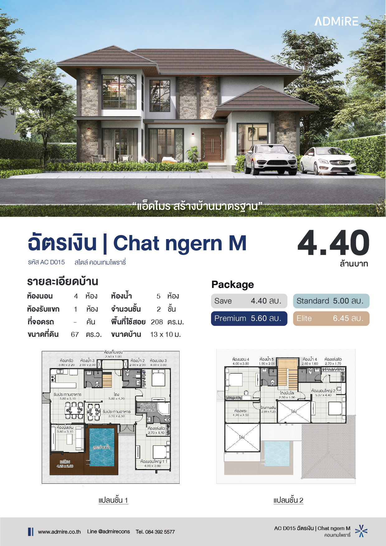 บ้าน 2 ชั้น สไตล์คอนเทมโพรารี่โมเดิร์น โดดเด่นผ่านการออกแบบด้วยโทนสีขาว เทา น้ำตาล เพิ่มมิติด้วยหลังคาทรงปั้นหยาสีเข้มซ้อนระดับให้บ้านมีเอกลักษณ์ ผนังตกแต่งด้วยหินธรรมชาติที่ให้ความรู้สึกอบอุ่นและสง่างาม จัดเต็มด้วยฟังก์ชันครบครัน ไม่ว่าจะเป็นห้องนั่งเล่น ห้องครัว หรือพื้นที่รับประทานอาหาร ด้านหน้าบ้านมีสระว่ายน้ำสไตล์รีสอร์ท ช่วยเติมเต็มความรู้สึกผ่อนคลาย และสะดวกสบายในทุกมิติ