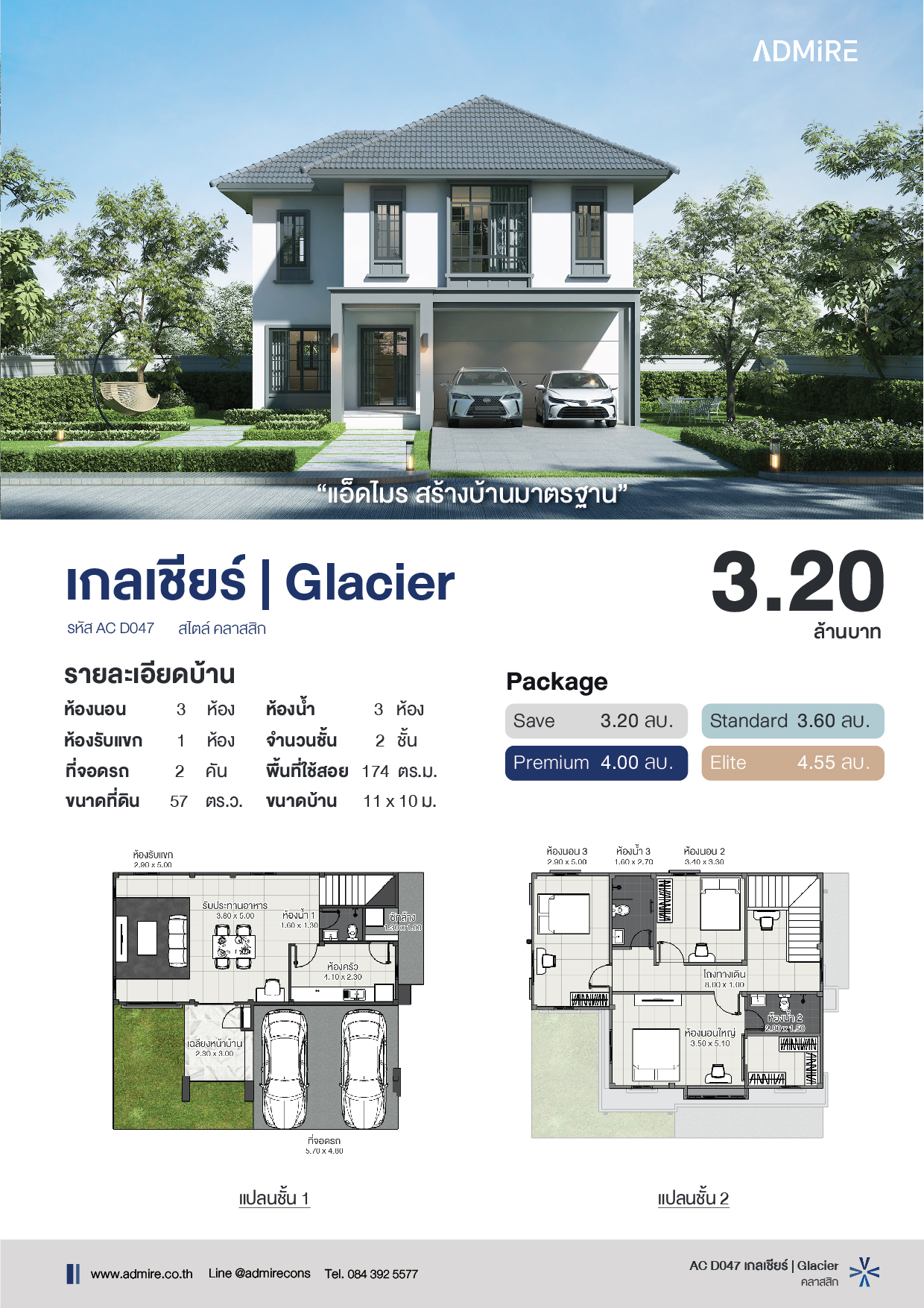 บ้านเกลเชียร์ออกแบบในสไตล์ คลาสสิกสองชั้น (Classic 2-storey) เน้นความภูมิฐาน หรูหรา และลงตัว เหมาะกับครอบครัวที่ต้องการภาพลักษณ์มั่นคงและพื้นที่ใช้สอยครบทุกฟังก์ชัน