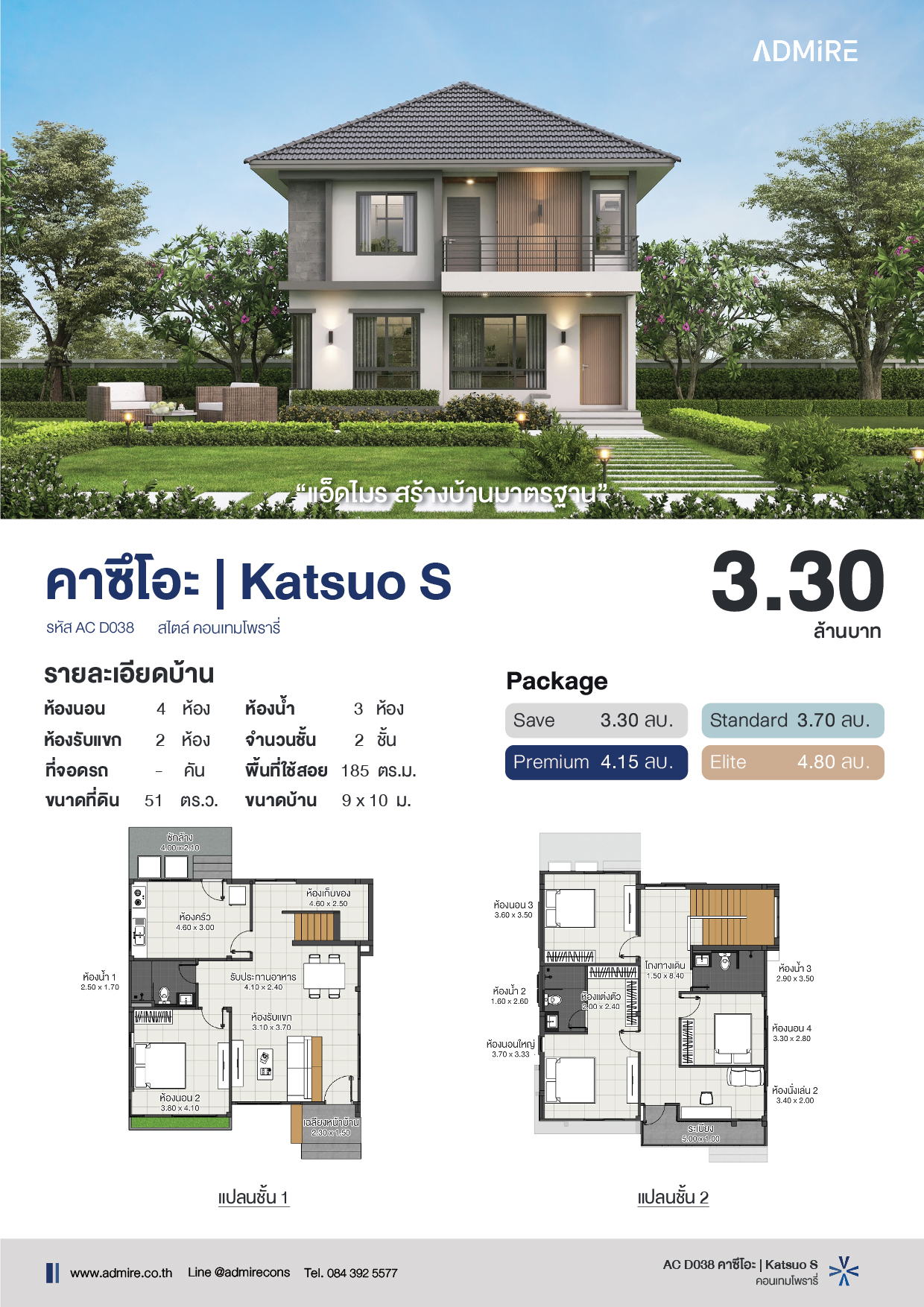 คาซึโอะ บ้านสองชั้นสไตล์คอนเทมโพรารี่ โทนสีหลักของบ้านเลือกใช้สีขาว สีเทา และสีน้ำตาลหลังคาทรงปั้นหยาสีเทาเข้มให้ความรู้สึกแข็งแรง เรียบหรู และทันสมัย ช่องกระจกบานใหญ่ช่วยดึงแสงธรรมชาติเข้าสู่ภายใน ทำให้บรรยากาศโปร่งโล่ง สบาย เหมาะสำหรับครอบครัวที่ต้องการความลงตัวทั้งในด้านฟังก์ชันการใช้งานและดีไซน์ที่ทันสมัย