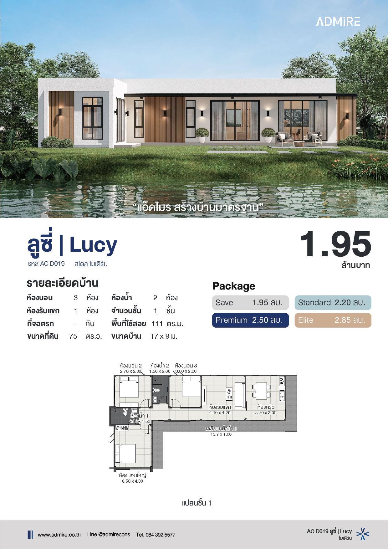“ลูซี่” บ้านชั้นเดียวสไตล์โมเดิร์น ออกแบบทันสมัยผ่านเส้นสายที่เรียบง่ายแต่สร้างเอกลักษณ์เฉพาะตัว โดยเลือกใช้ผนังสีขาวตัดกับสีน้ำตาลธรรมชาติจากไม้ระแนงตกแต่งให้ความรู้สึกอบอุ่น ผสมผสานกับประตูและกระจกบานใหญ่ช่วยรับลมและแสงธรรมชาติ เหมาะสำหรับครอบครัวที่กำลังมองหาบ้านสไตล์รีสอร์ต บ้านชั้นเดียวที่ตอบโจทย์ทุกฟังก์ชันการใช้งานในทุก ๆ วัน