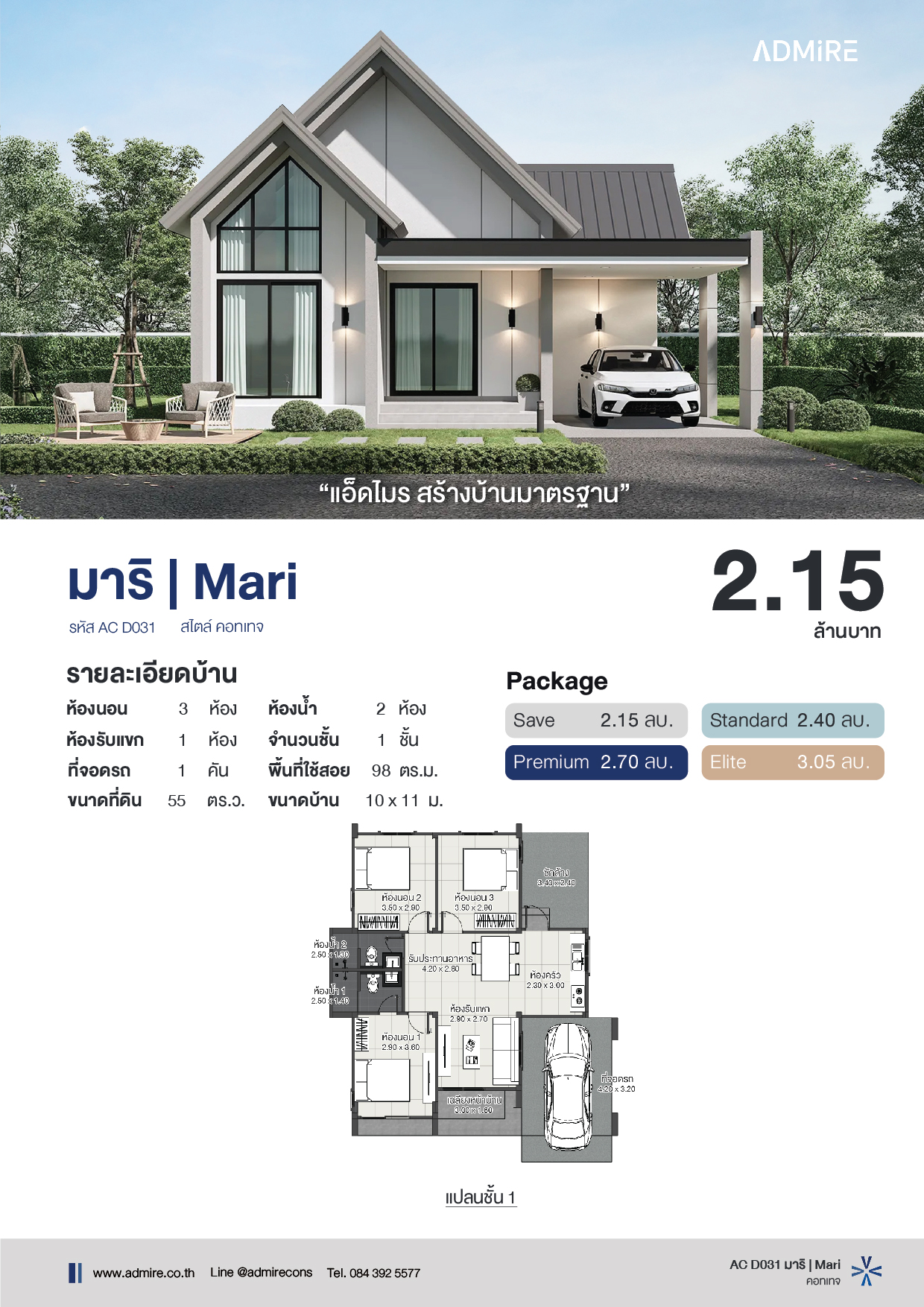 ฮิคาริ บ้านชั้นเดียวดีไซน์คอนเทมโพรารี่หลังนี้ โดดเด่นด้วยเส้นสายเรียบง่ายแต่แฝงด้วยความทันสมัย ตัวบ้านเลือกใช้โทนสีขาวสะอาดตา ตัดกับหลังคาทรงปั้นหยาสีเทา สร้างมิติและความอบอุ่นในเวลาเดียวกัน ฟังก์ชันภายในเน้นการใช้พื้นที่อย่างคุ้มค่าถือเป็นหนึ่งในแบบบ้าน คอนเทมโพรารี่ ที่เหมาะกับการใช้งานของทุกครอบครัว