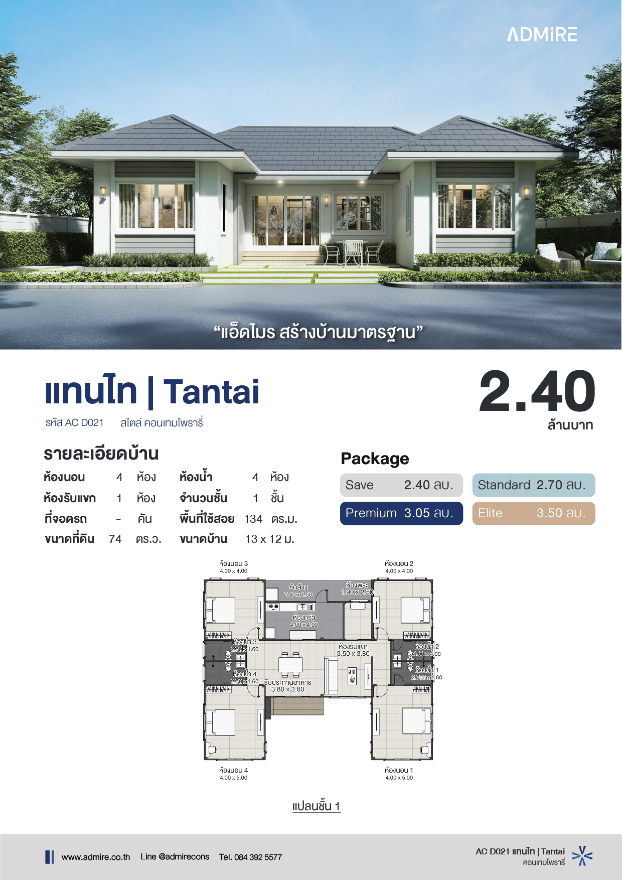 แทนไท บ้านชั้นเดียว บ้านสไตล์คอนเทมโพรารี่โมเดิร์น (Contemporary Modern) ที่ออกแบบอย่างประณีต ผสมผสานความเรียบง่ายเข้ากับความอบอุ่น หลังคาทรงปั้นหยา เพิ่มความมีมิติให้ตัวบ้านโดยเลือกใช้สีขาว และสีเทา มาพร้อมพื้นที่ใช้สอย 134 ตร.ม. รองรับทุกไลฟ์สไตล์ของทุกคนในครอบครัว