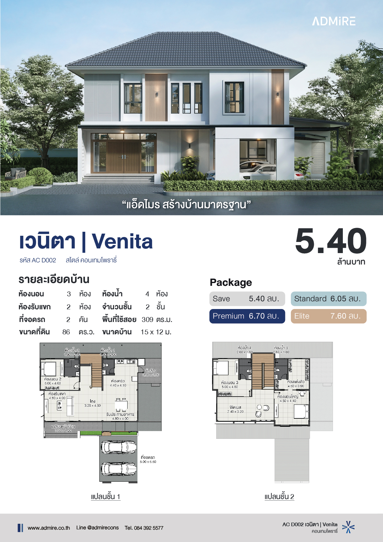 บ้านสองชั้น สไตล์คอนเทมโพรารี่ ผสมผสานกลิ่นอายความโมเดิร์น โดดเด่นด้วยเส้นสายสถาปัตยกรรมที่เรียบง่ายแต่ทรงพลัง ให้ความรู้สึกสงบ อบอุ่น จากโทนสีขาว เทา และน้ำตาล เข้ากับดีไซน์เรียบหรูเหนือกาลเวลา โทนสีขาวสะอาดตา ตัดกับเฉดสีเทา และกลิ่นอายของไม้สีน้ำตาลธรรมชาติจากระแนงตกแต่ง ทุกตารางนิ้วถูกจัดวางอย่างลงตัวเพื่อการพักผ่อนอย่างแท้จริง
