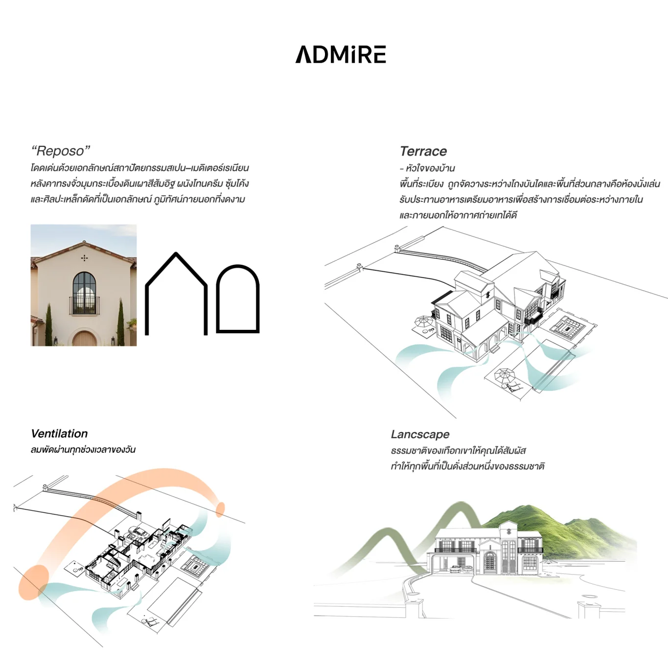 Reposo ถูกออกแบบในสไตล์ Modern Mediterranean ซึ่งเป็นการตีความสถาปัตยกรรมเมดิเตอร์เรเนียนแบบดั้งเดิมให้ร่วมสมัยมากขึ้น ลดทอนรายละเอียดที่ซับซ้อน แต่ยังคงเอกลักษณ์สำคัญไว้ครบถ้วน ทำให้บ้านดูสง่างาม เรียบง่าย และไม่ตกยุค